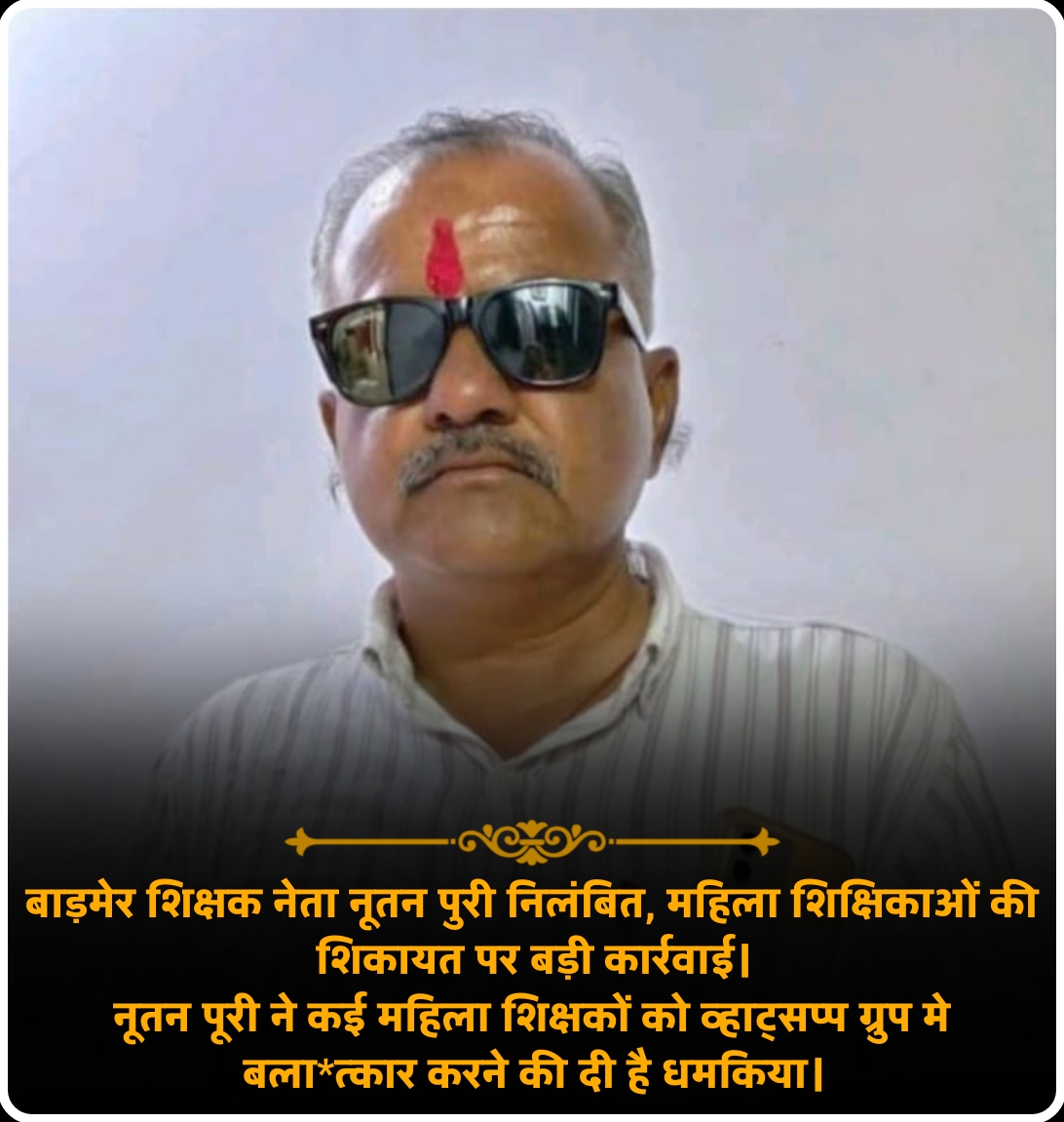 Read moreबाड़मेर शिक्षक नेता नूतन पुरी निलंबित, महिला शिक्षिकाओं की शिकायत पर बड़ी कार्रवाई। बाड़मेर शिक्षक नेता नूतन पुरी निलंबित, महिला शिक्षिकाओं की शिकायत पर बड़ी कार्रवाई।नूतन पूरी ने कई महिला
