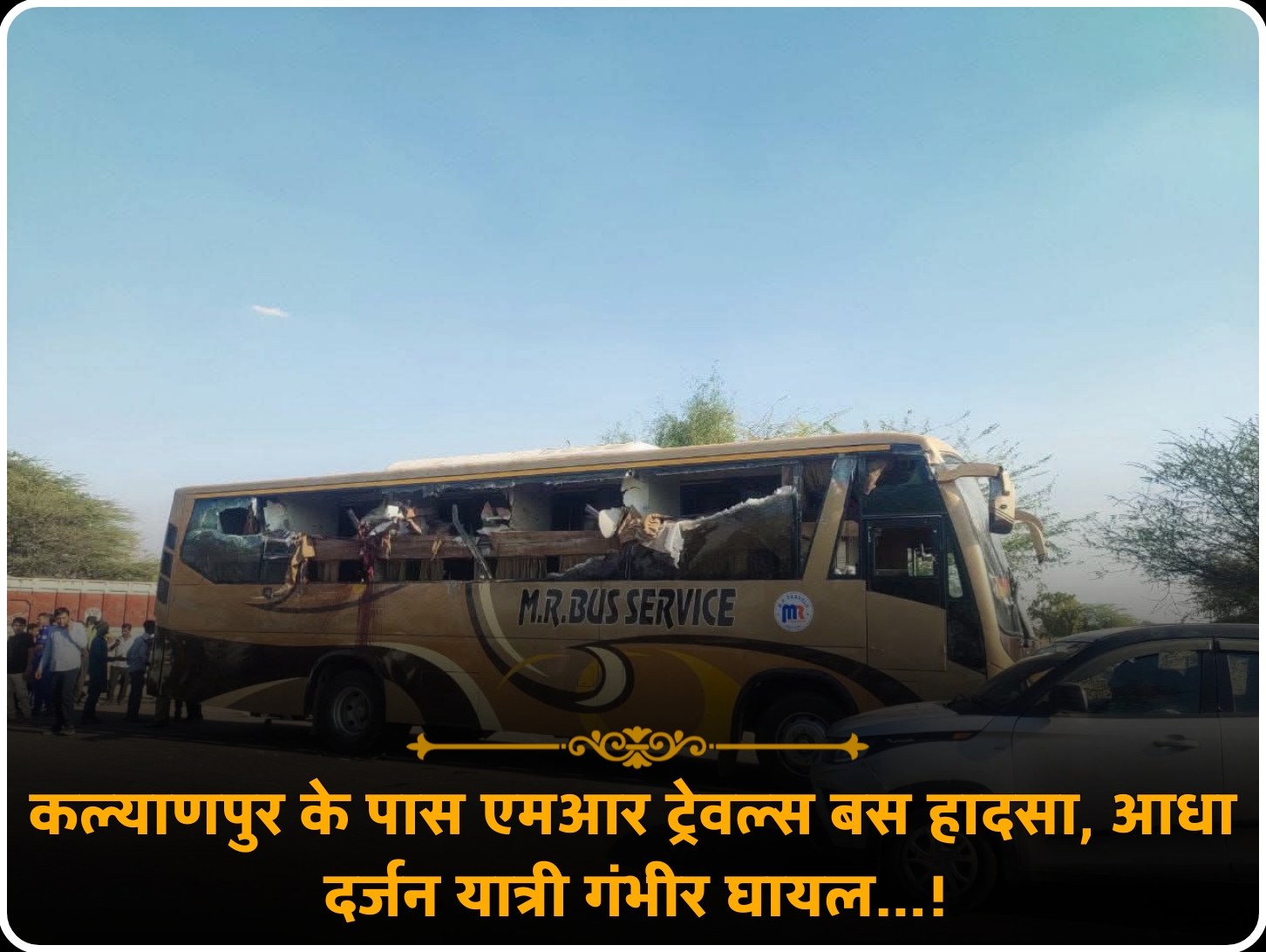 Read moreकल्याणपुर के पास एमआर ट्रेवल्स बस हादसा, आधा दर्जन यात्री गंभीर घायल…!! कल्याणपुर के पास एमआर ट्रेवल्स बस हादसा, आधा दर्जन यात्री गंभीर घायल… #बालोतरा जिले के #कल्याणपुर के पास